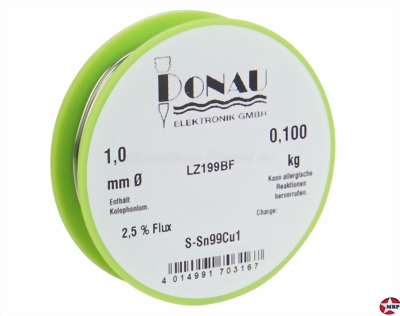 - Durchmesser: 1mm - Bleifrei - Legierung S-Sn99Cu1 - 99% Zinn, 1% Kupfer - Schmelzpunkt ca. 240°C - 2,5% Flussmittelanteil Gemäß von EU-Richtlinien, der so genannten ROHS-Direktive, Lötdraht jetzt auch Bleifrei. Mit dieser Richtlinie wird die Verwendung von Blei, Cadmium, Quecksilber usw. teilweise verboten. Deshalb bieten wir ab sofort auch bleifreies Lötzinn in zwei Ausführungen an (mit und ohne Silberanteil). Die bleifreien Lötdrähte sind auch mit Flussmittelfüllung